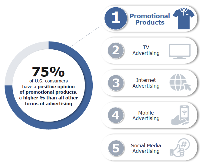 Here’s the big one: 75% of U.S. consumers have a positive opinion of promotional products. That ranked higher than TV ads, internet ads, mobile ads, and social media ads. First place across every advertising format ASI evaluated.