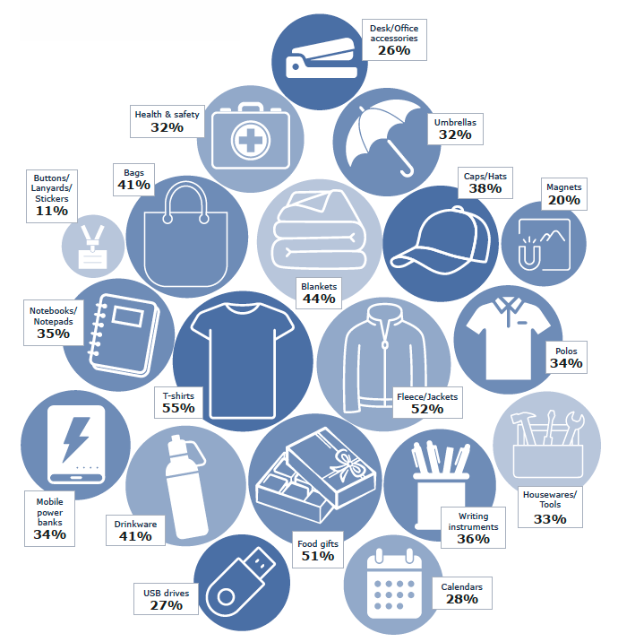 What gets people most excited? T-shirts came in at 55%, fleece jackets at 52%, and food gifts at 51%. Bags, drinkware, blankets, and caps were close behind.