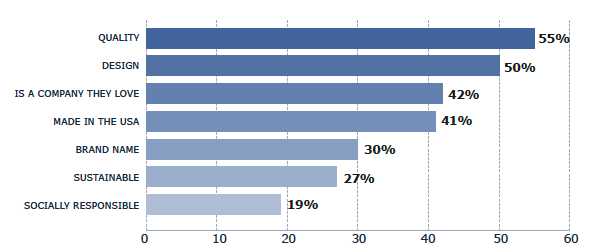 One of the more telling sections of the study looked at what influences whether someone would actually purchase a branded product. Quality topped the list at 55%, followed by design at 50%. Being from a company they love came in at 42%, and Made in the USA was right behind it at 41%.